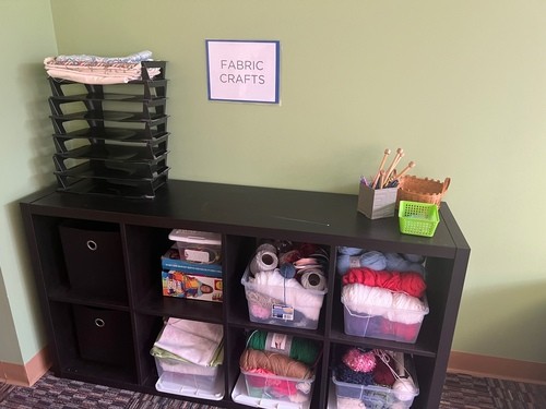You'll find a sewing machine, fabric, and yarn along with a button maker with all the supplies.