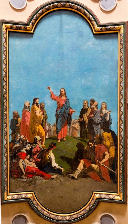 Le sermon sur la montagne (The Sermon on the Mount, 1878), oil painting on canvas by Guillaume Fouace (1837-1895). Church of Notre-Dame de Montfarville, Manche, Normandy, France.